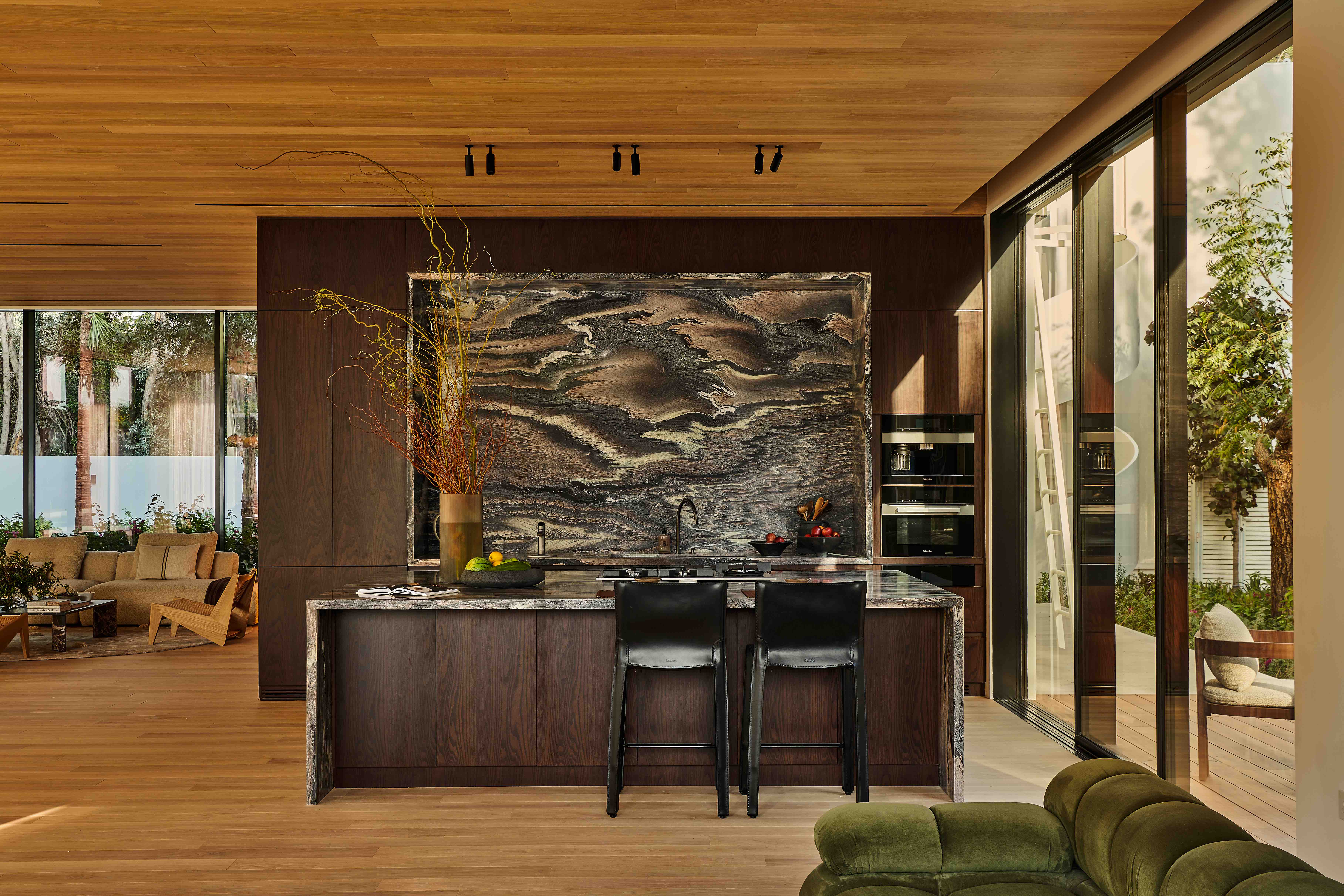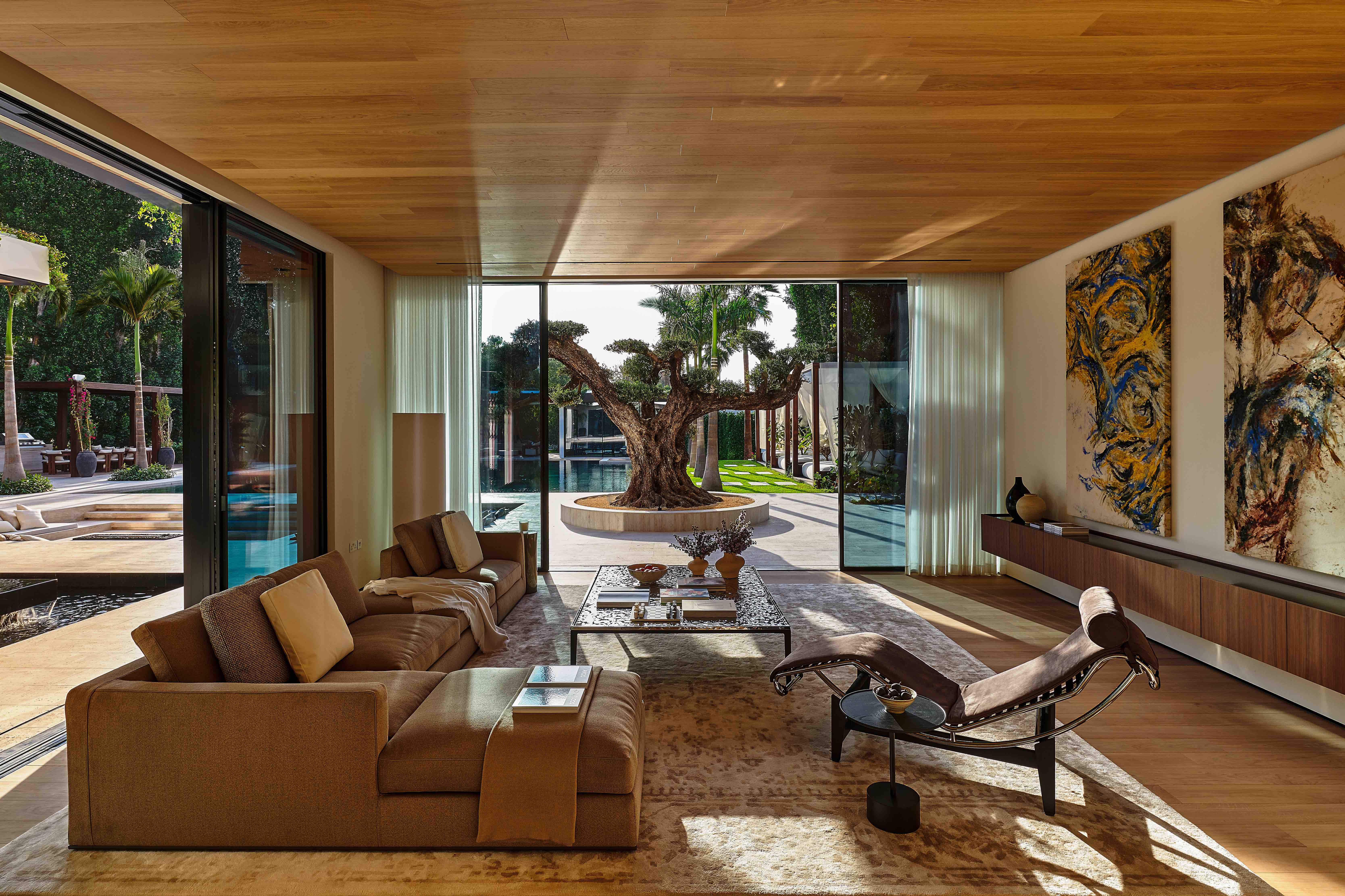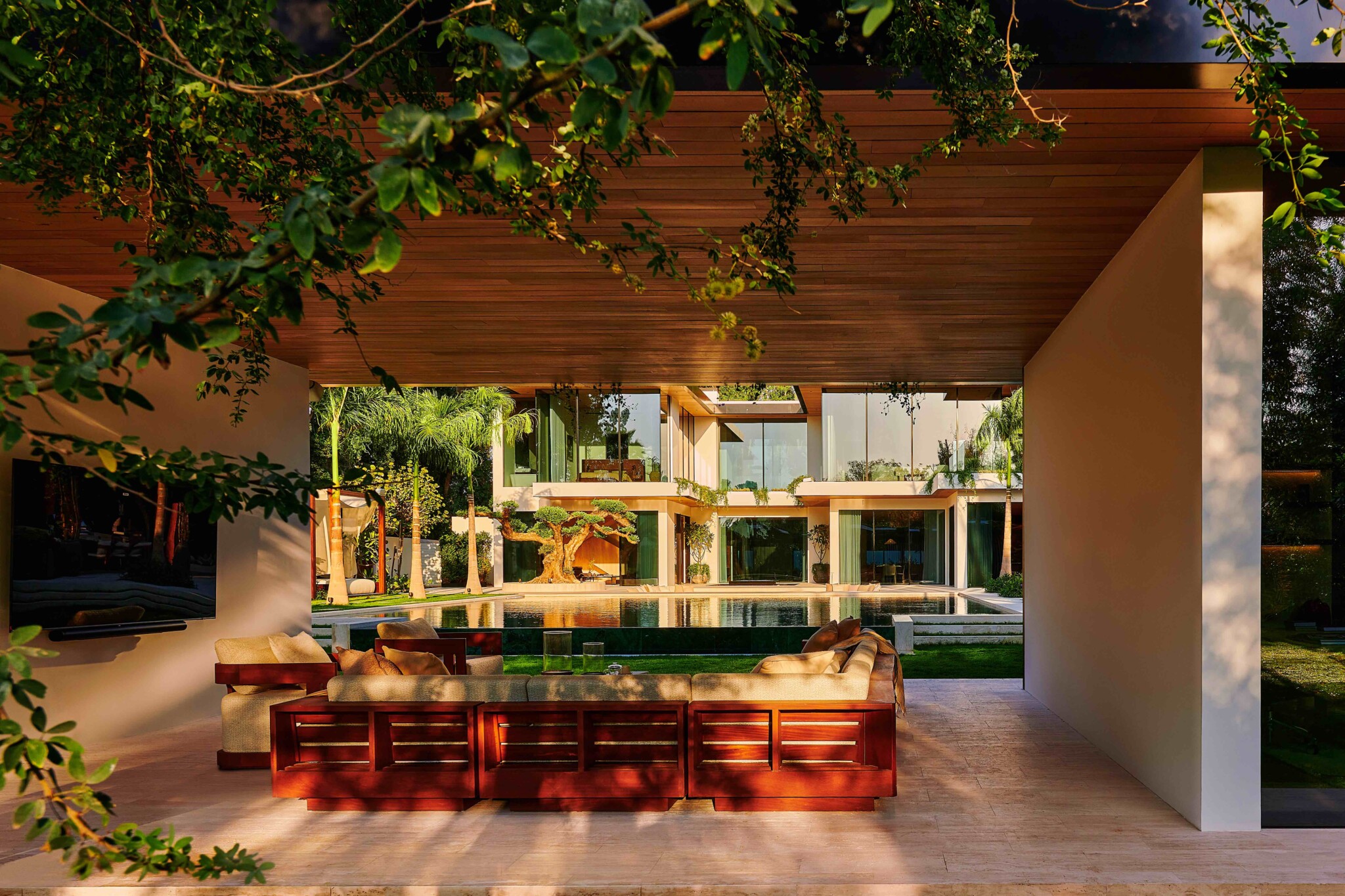 Perched along a curving waterway, the villa is a masterclass in modern, nature-integrated design. Its rectilinear volumes and expansive floor-to-ceiling glazing dissolve the boundary between interior and exterior, with each space opening directly to lush gardens or balconies. The residence is anchored by a sculptural travertine staircase and double-height, skylit atrium, and finished with rich materials such as oak flooring, European-sourced marble, and timber-lined ceilings.