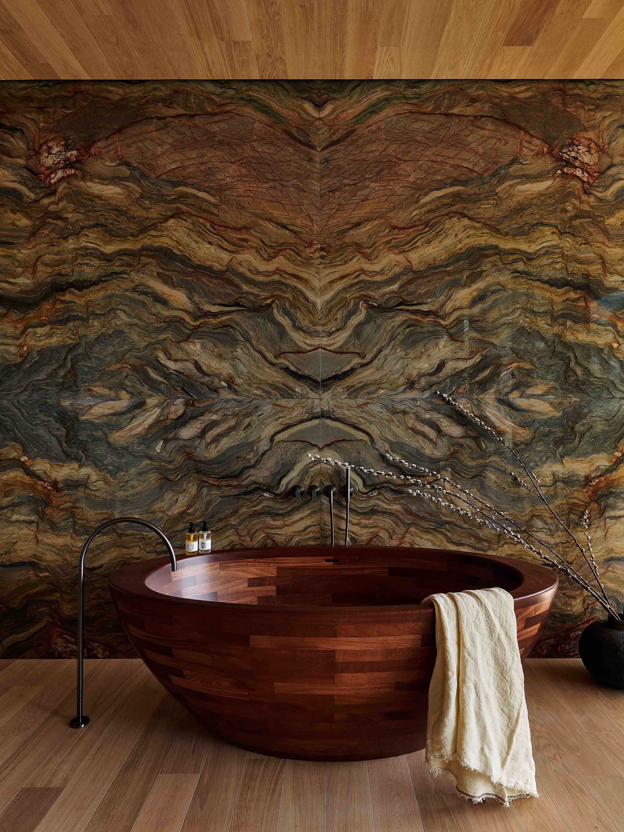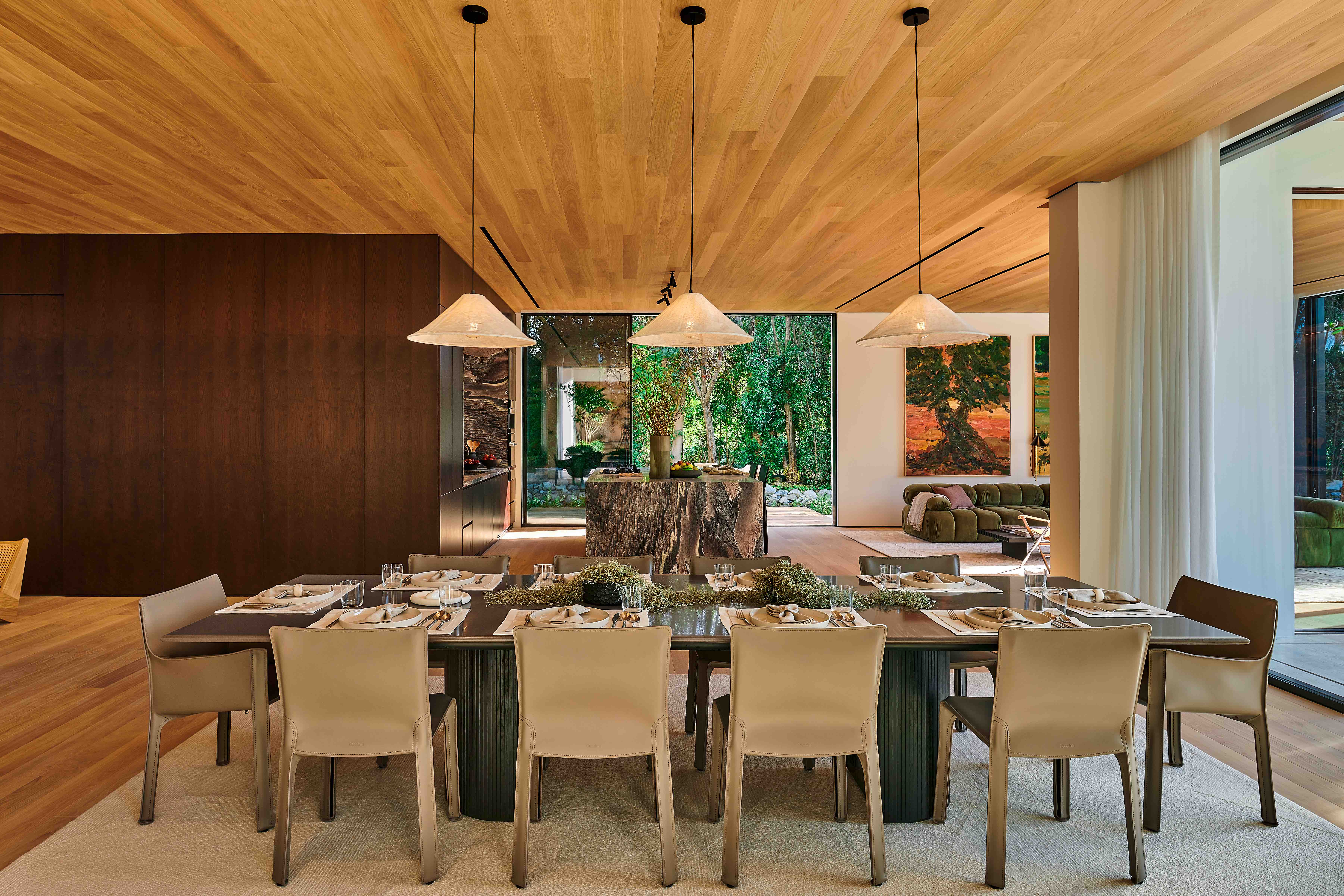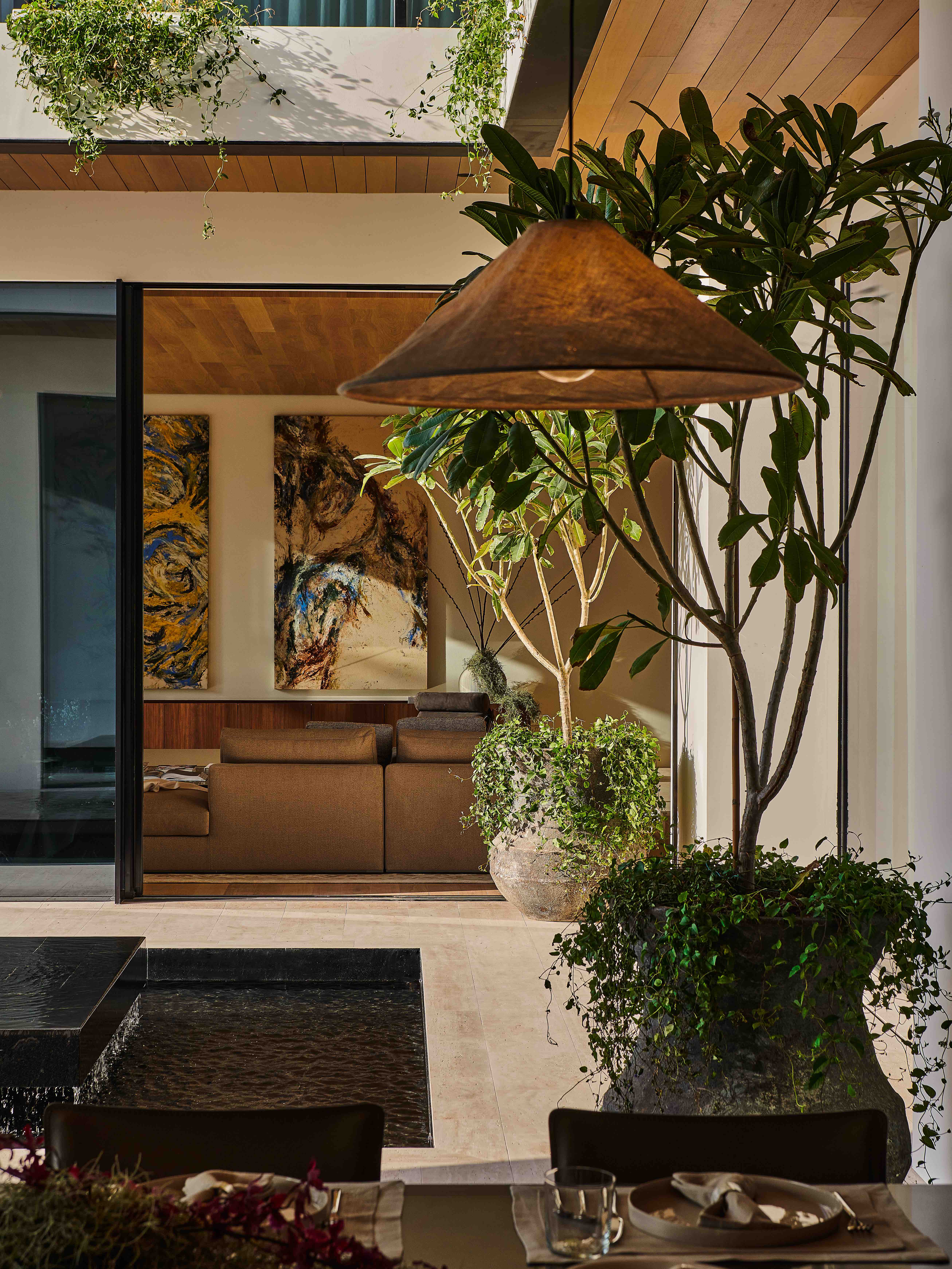 Perched along a curving waterway, the villa is a masterclass in modern, nature-integrated design. Its rectilinear volumes and expansive floor-to-ceiling glazing dissolve the boundary between interior and exterior, with each space opening directly to lush gardens or balconies. The residence is anchored by a sculptural travertine staircase and double-height, skylit atrium, and finished with rich materials such as oak flooring, European-sourced marble, and timber-lined ceilings.